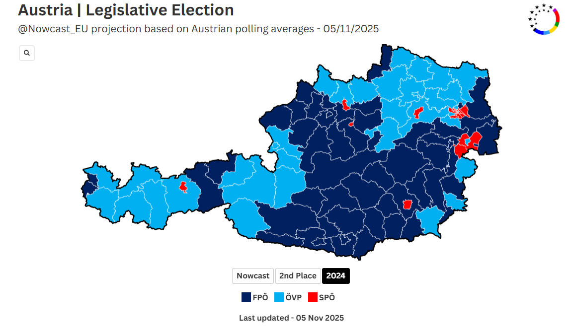 S výnimkou niekoľkých okresov vo Viedni by protiimigračná a ukrajinsky skeptická Slobodná strana Rakúska (FPÖ) zvíťazila v každom okrese a meste.