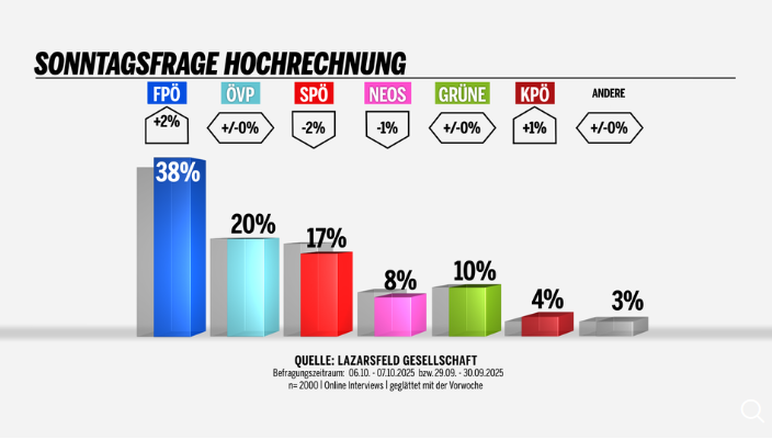 Na základe aktuálnych priemerov výskumu má FPÖ 37,2 percenta, Rakúska ľudová strana (ÖVP) 21 percent, Sociálni demokrati (SPÖ) 17 percent a Zelení 10,9 percenta.