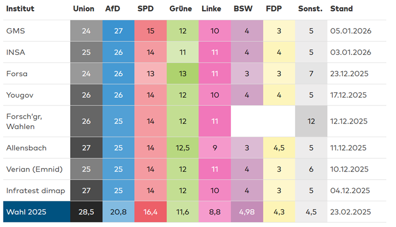 Podľa prieskumov GMS a INSA je AfD už na prvom mieste (s 27 a 26 percentami), zatiaľ čo v iných inštitútoch – ako napríklad Allensbach alebo Infratest dimap – má Únia stále mierny náskok, no zvyčajne ide o rozdiel do dvoch percentuálnych bodov.