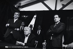 Príspevok sprevádza čiernobiela fotografia Trumpa sediaceho pri stole so sústredeným výrazom a amerického ministra zahraničných vecí Marca Rubia , ktorý stojí neďaleko so skríženými rukami.