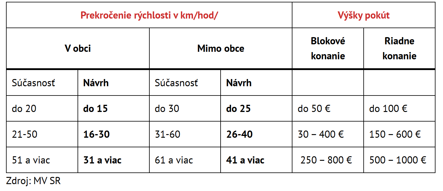 Výšky pokút síce zostávajú rovnaké, no nadol sa posúvajú hranice, od ktorých sa ukladajú. Pre príklad: vodič pri prekročení rýchlosti v obci o 31 km/h a mimo obce o 41 km/h dostane pokutu od 250 do 800 eur. Okrem toho mu policajt môže na mieste zadržať vodičské oprávnenie.